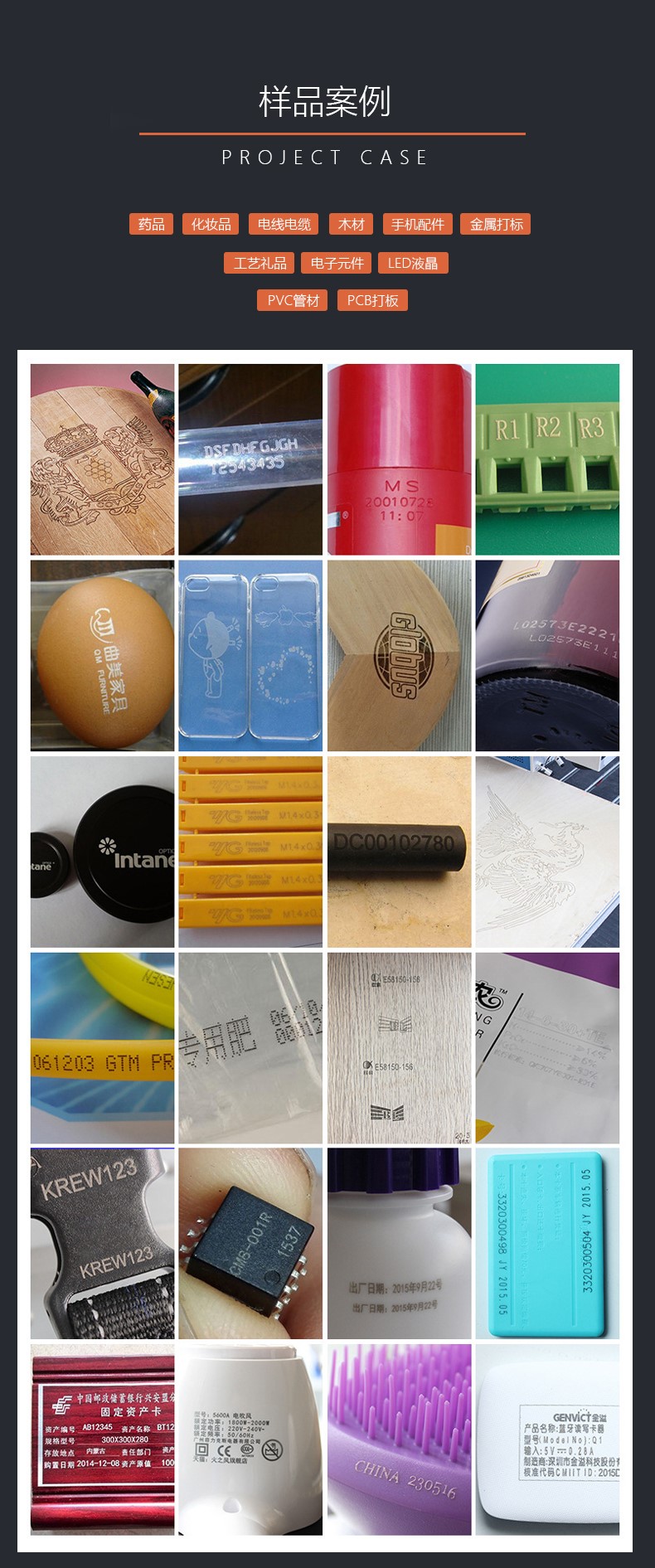 :電容、電感、印制電路板、集成電路、電器接插卡、各類儀表和控制面板的激光打標。